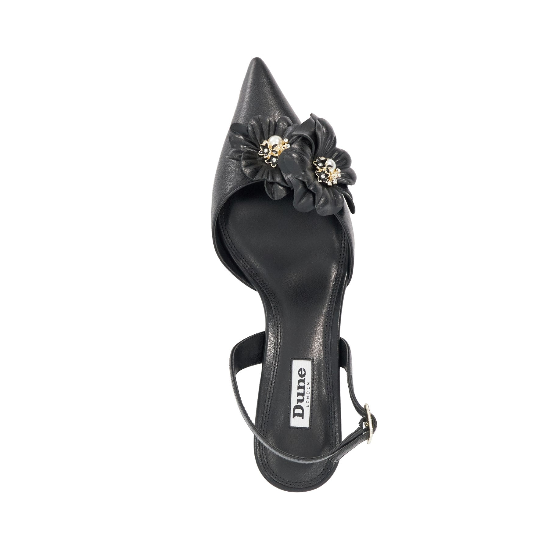 A feminine design featuring our signature floral detailing on the front, add an element of sophistication to your evening ensembles with our Cassandra kitten heels. Embellished with two ornate pearl and enamel detail floral corsages, this romantic style rests on a comfortable kitten heel making it the perfect day to evening option. Complete with a diamante emellished adjustable sling strap.