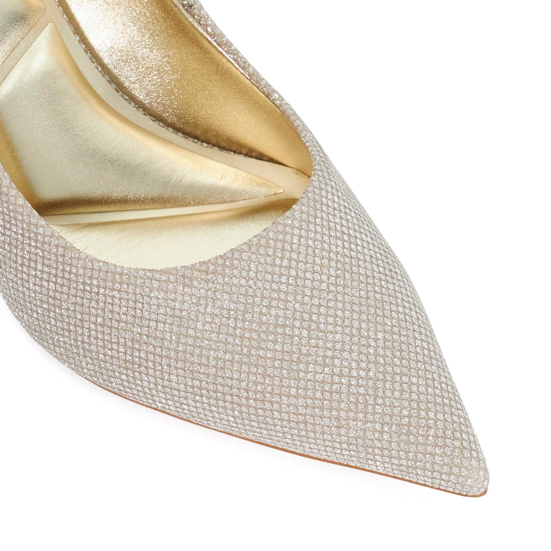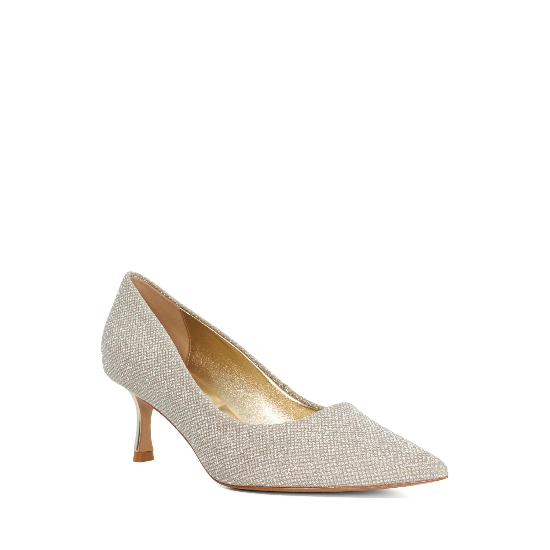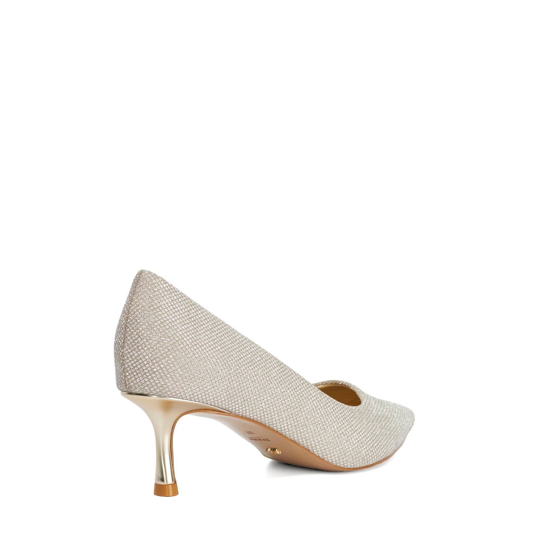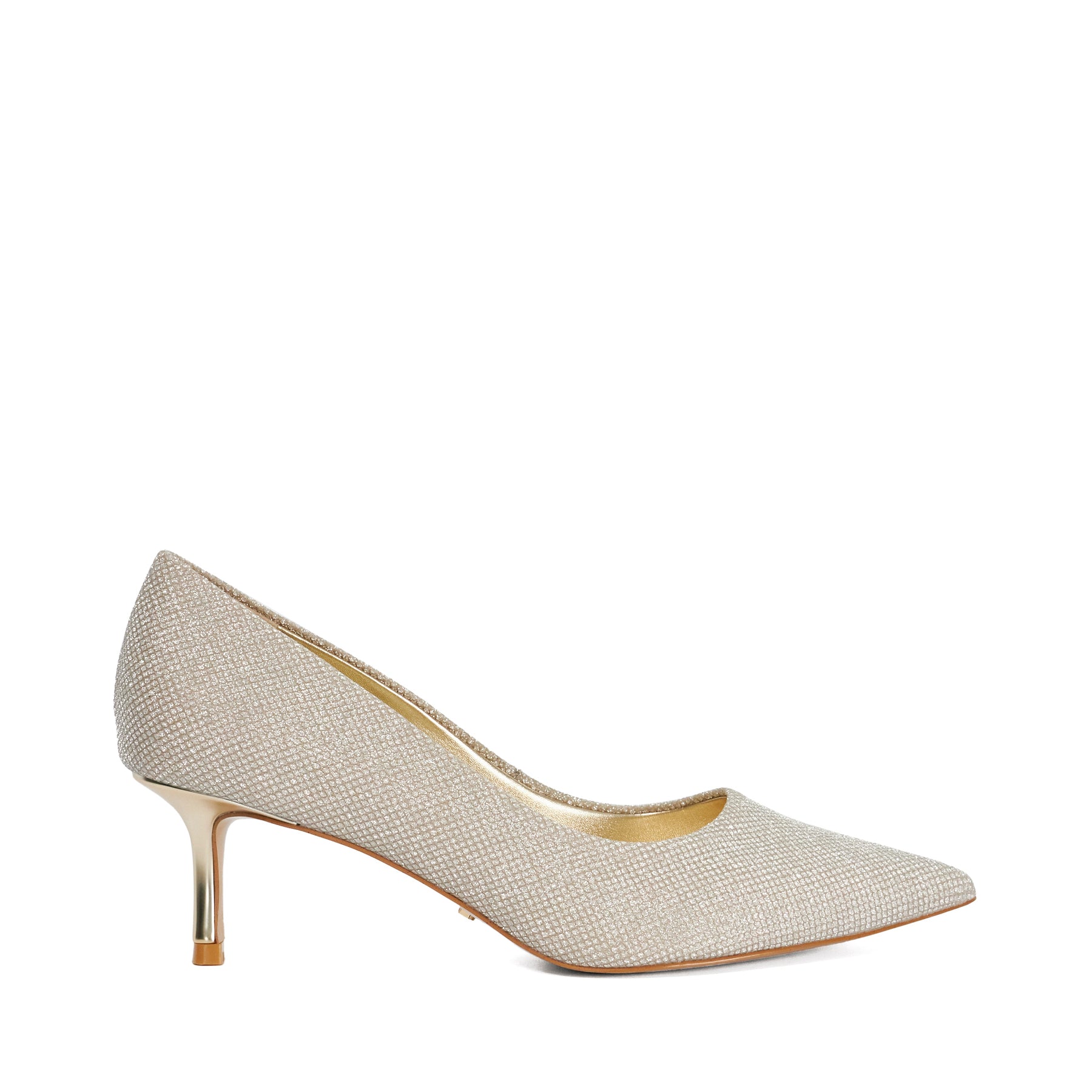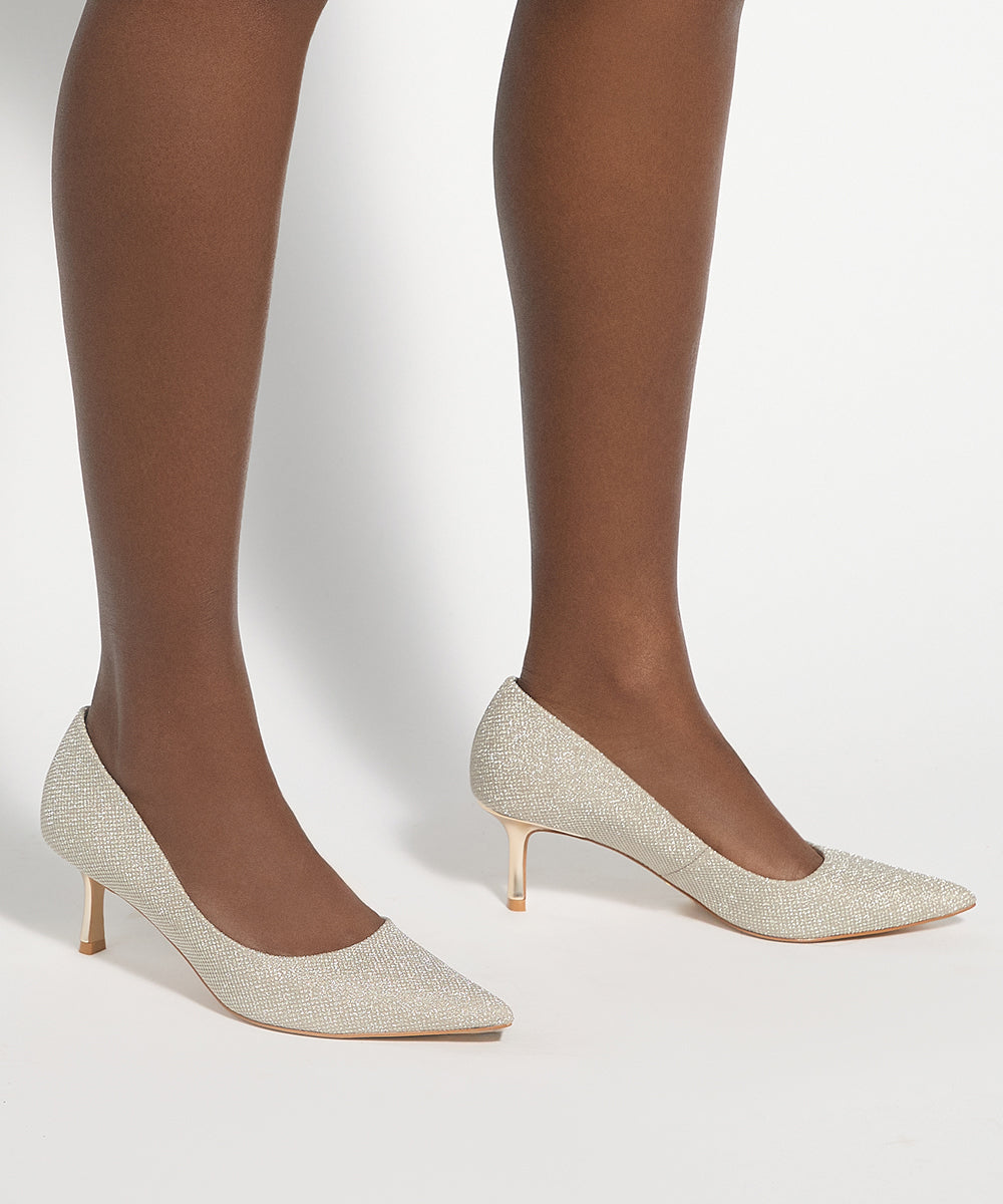 Elevate your ensemble with these sparkly gold courts. Adorned with shimmering embellishments they're designed to add a refined touch of glamour to any look. Finished with a mid-height metallic gold heel and a sleek pointed toe this elegant style is perfect for special occasions and evening wear alike.