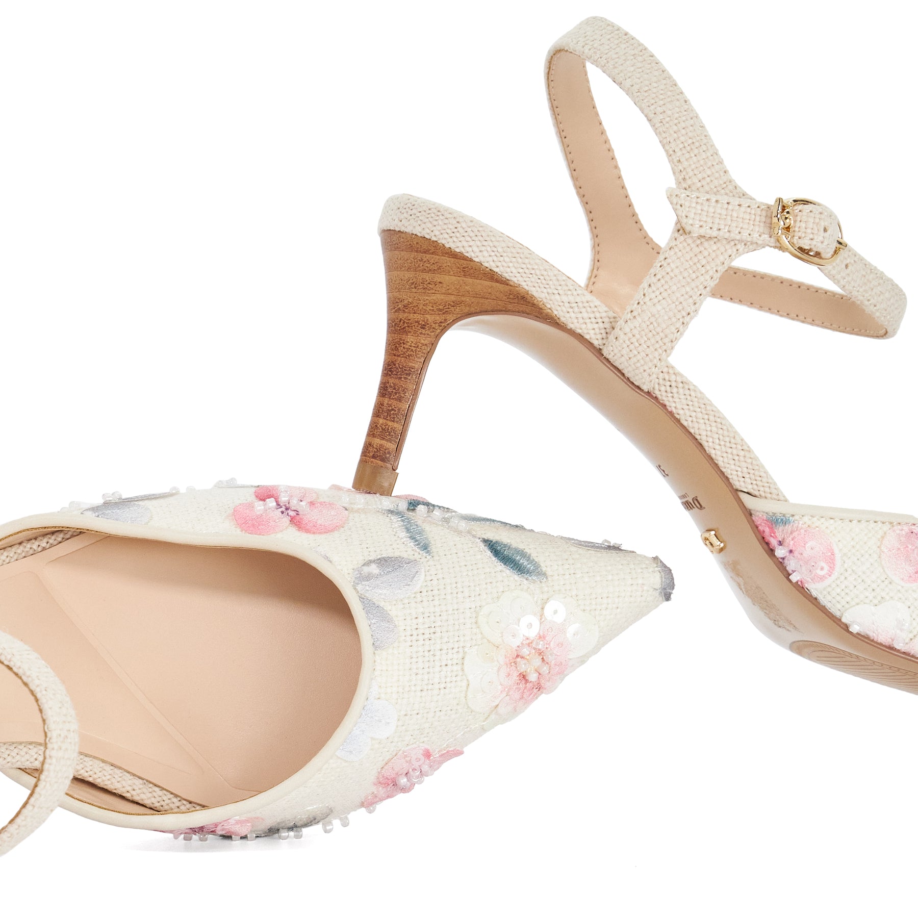 Floral court shoes reimagined with a contemporary edge Cultivated is crafted in a refined floral print. This elegant silhouette features a sleek buckle fastening and a mid-height stacked heel for effortless wear. Polished yet playful they bring a fresh lift to everything from tailored trousers to fluid dresses.